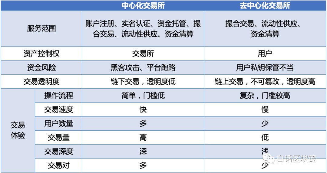 综上,我们通过一个表格来展示中心化交易所和去中心交易所的区别: