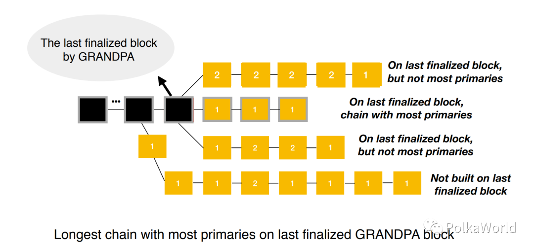带着 BABE 和 GRANDPA 混合机制,波卡的分叉选择变得清晰起来。BABE 一定要建立在 GRANDPA 最终确定的链上。当在最终确定之后有分叉时,BABE 通过构建具有最主要区块的链来提供概率最终性。