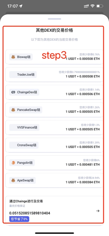 系统会自动爬行抓取链上DEX的流动性(目前支持EVM链上20个DEX),然后可以清晰地看到对比数据,最高差值是ApeSwap,高达24.94%,与PancakeSwap差值也有1.26%,这意味着我用Chainge 的跨链流动性聚合器可以比在ApeSwap和PancakeSwap多获得24.94%和1.26%数量的ETH!