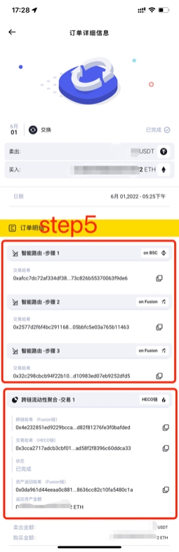 订单从开始到显示完成大约是30-50秒左右,订单路径非常清晰,因为我的USDT在BSC链上,所以整个交换过程是:BSC链-Fusion链—HECO链(交换ETH)。所以我只需要选择一次要交换的币种,剩下的就交给跨链流动性聚合器自动帮我完成即可。