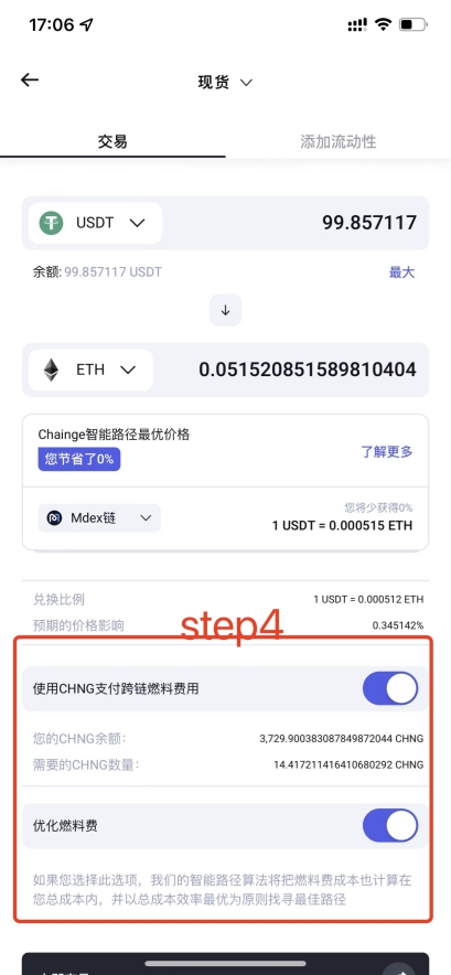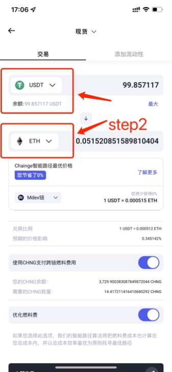 下面是我用Chainge的跨链流动性聚合器中用USDT交换ETH的过程: