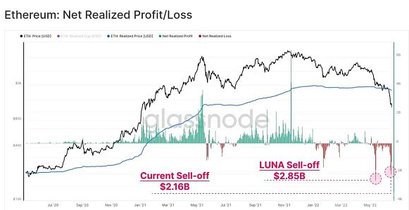 在以太坊持有人持有如此巨大的未实现损失的情况下,我们可以转向支出行为,观察实际支出所锁定的利润或损失的大小。5月初由LUNA推动的抛售仍然是以太坊投资者实现损失的历史最高值,一天内有28.5亿美元的资本外流。目前的去杠杆化紧随其后,在6月14日达到了21.6亿美元的损失。