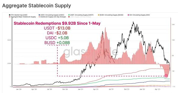 自5月初以来,稳定币赎回总额为99.2亿美元,资本从市场流出。USDT的赎回量最大,为-130亿美元,其次是DAI,为-20亿美元,因为投资者关闭了通过MakerDAO金库获得的杠杆(或被清算)。有趣的是,自5月1日以来,USDC的供应量增加了50亿美元,这表明市场的偏好可能从USDT转向USDC,成为最受欢迎的稳定币。