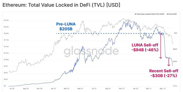 杠杆以及市场在牛市期间积累的递归借贷头寸被关闭,随着锁定在DeFi协议中的代币被重新定价,加密货币抵押品的价值下降,这往往是上述第1点产生的卖方的结果。