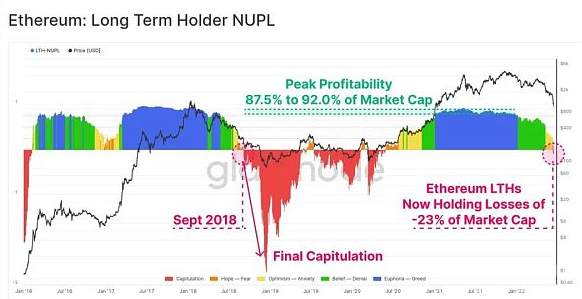 我们还可以调查以太坊长期持有者的未实现利润和损失总额,长期持有者未实现的净利润/损失(LTH-NUPL)指标显示,这一群体目前的盈利能力已经超过了收支平衡点,现在持有的未实现的损失相当于市值的23%。这意味着,即使是最强大的、持续时间最长的ETH投资者,现在的平均仓位也处于水下。上一次出现这种情况是在2018年9月,当时价格从230美元跌至84美元,下跌了64%,出现了更严重的抛售。