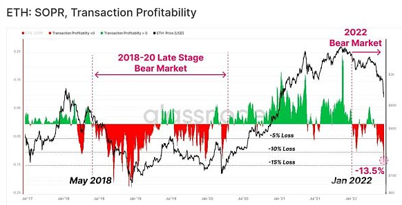 最后,我们可以看一下相对的以太坊链上交易盈利能力指标(SOPR),看一下总体市场正在实现盈利或亏损的制度。这也证实了以太坊市场很可能在2022年1月确认过渡到熊市,当损失开始主导支出行为。类似的行为可以在2018年5月看到,这是在深度熊市之前,花了近2年的时间来恢复,最终在2020年3月的抛售中达到高潮。