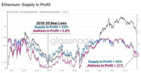 供应百分比(蓝色)和利润中的地址(粉色)是两个高层次的链上指标,用于衡量以太坊市场目前的财务与过去的周期。网络盈利能力目前已达到2020年6月以来的最低水平,当时市场正在从COVID崩溃中恢复。供应和地址的盈利能力都表明,约有一半的以太坊持有者对其持有的资产处于水下。请注意,2018年、2019年和2020年的熊市低点达到了23%的供应量和仅2.8%的地址的盈利能力。如果这个周期达到类似的水平,这也许描绘了有点可怕的未来道路。