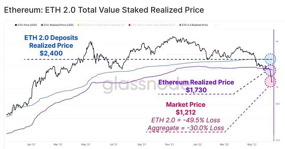 随着ETH现货价格现在交易在1212美元(6月17日),总体市场现在远远低于1730美元的实现价格。这意味着市场持有的平均未实现的损失为-30.0%。如果我们特别看向ETH 2.0的储户,我们可以直接衡量ETH代币在存入时的价值,因为它们不能被解除抵押品。在此基础上,ETH 2.0储户的实现价格成本基础要高得多,为2400美元,因此平均未实现的损失为-49.5%。