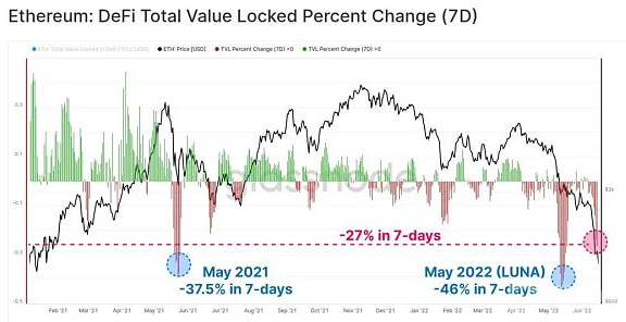 按7天计算,最近的这两次TVL冲销都是过去18个月中最重要的一些时间,最近的抛售促使TVL在一周内收缩了-27%的TVL。从这个指标来看,只有两个更大规模的去杠杆化事件;第一个是与最近的LUNA崩溃相关的-46.0%,以及2021年5月从当时的ATH抛售期间的-37.5%。