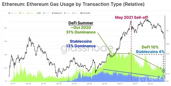下面的图表显示了稳定币(蓝色)和DeFi应用(绿色)的气体使用量的主导地位。稳定币传输,和DeFi协议现在分别占当前以太坊gas使用量的5.2%,和10.2%。自2021年5月的市场高点以来,这种利用主导地位已经稳步下降,当时稳定币和DeFi分别占据了11.4%和33.4%的gas使用量。