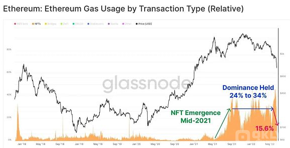 在以太坊生态系统的许多方面,需求状况一直在减弱,一般应用的使用率在下降,而在2021年11月的ATH之后,网络拥堵情况有所缓解,最近几周,NFT市场的冷却变得很明显。