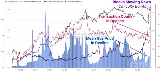 平均gas价格在最近几周略有回升,然而这更可能是由于区块间隔放缓(紫色)导致的拥堵,因为即将到来的合并的难度炸弹。