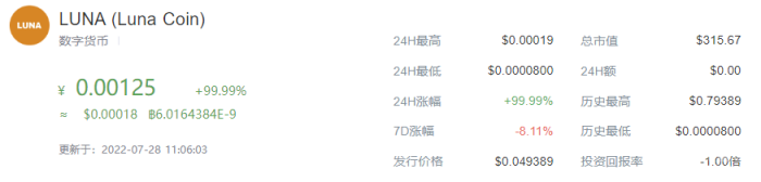 luna币最新消息,Luna币今日最新价格实时行情走势分析!截止2022年7月28日上午11点00分,Luna币最新价格为1.80美元。
