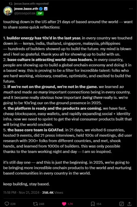 我真的保存了几十条推文,因为我在寻找一些可以发在这里的推文,以展示他的个人特质,尤其是他是如何让 Base 成为今天的模样的。翻阅他的 Twitter 时间线简直是无尽的精彩。我推荐你自己去看看,但对于懒人来说,也就是 99% 的你们(如果我处于你们的位置,也会是我),这里有几条我最喜欢的推文: