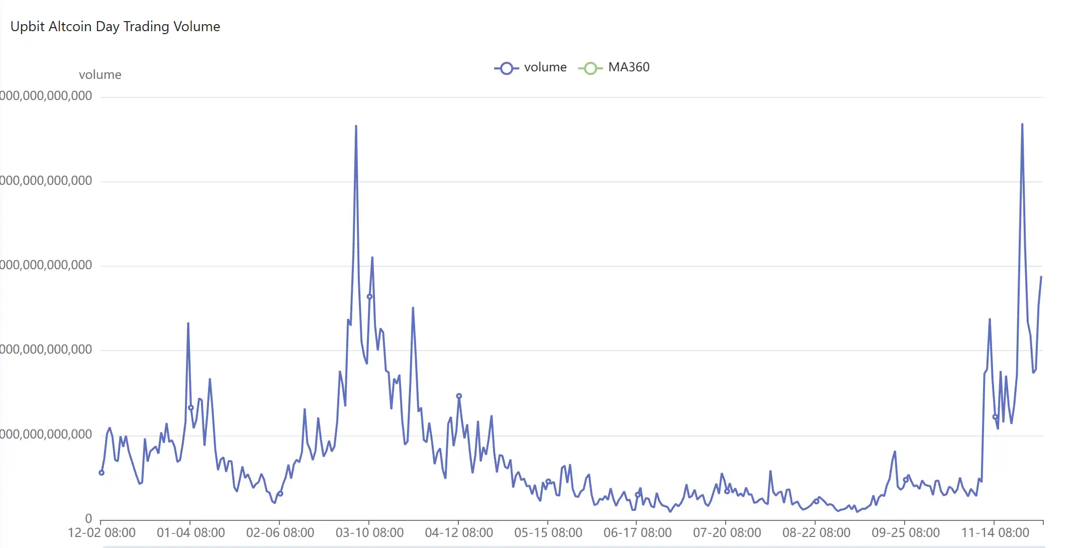 然而当这些币爆拉 5 倍之后,什么时候才是个头呢?也许答案也藏在韩国大妈背后。根据 Upbit Altcoin 的日交易量数据可以看到,最近的交易量已经达到了 3 月小牛的顶点。Upbit Altcoin 的日交易量可以视为牛市 fomo 的信号指标。