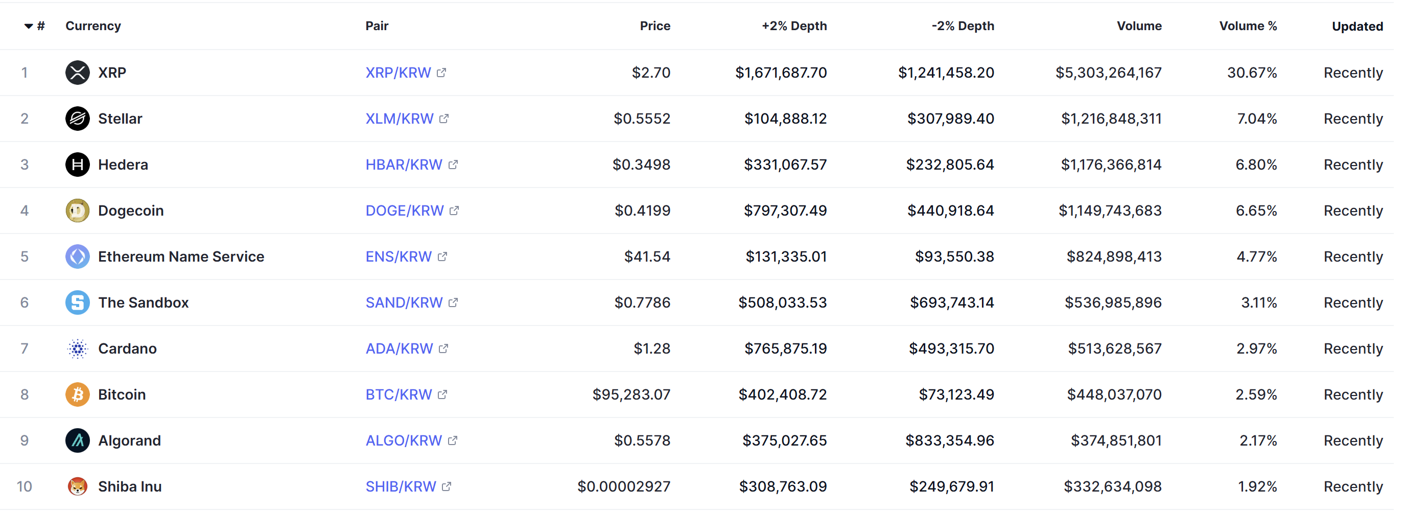 下面是韩所 Upbit 的成交量列表,你会发现 BTC 在这个排行里只能算「弟弟」。XRP 的成交量是 BTC 的 10 多倍,XLM(Stellar)和 HBAR(Hedera)这种在华语圈鲜有身影的项目也在榜上「赫赫有名」。