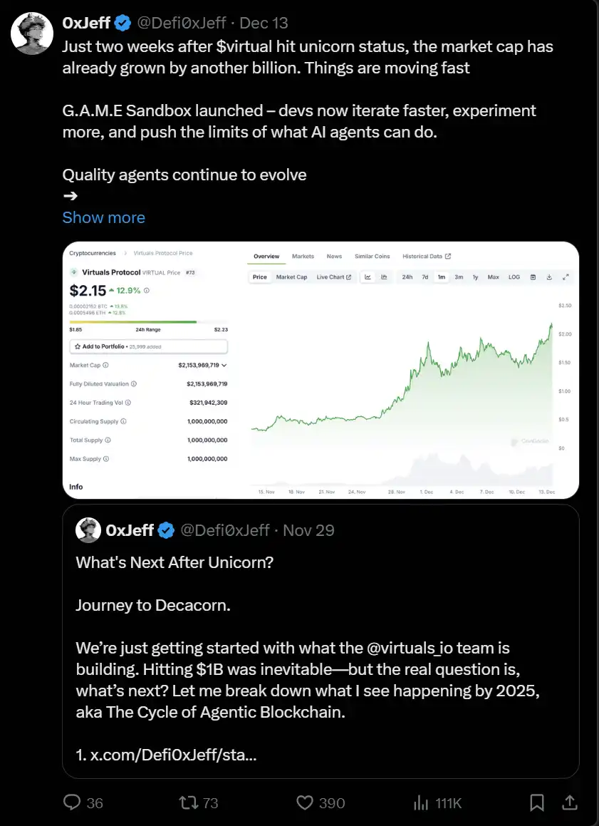 AI 代理的概念始于 2024 年 10 月,Virtuals 为代理所有权创造了市场。时至今日,$VIRTUAL 的市场价值已达到 25 亿美元。
