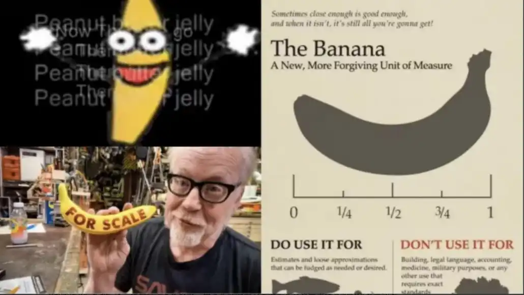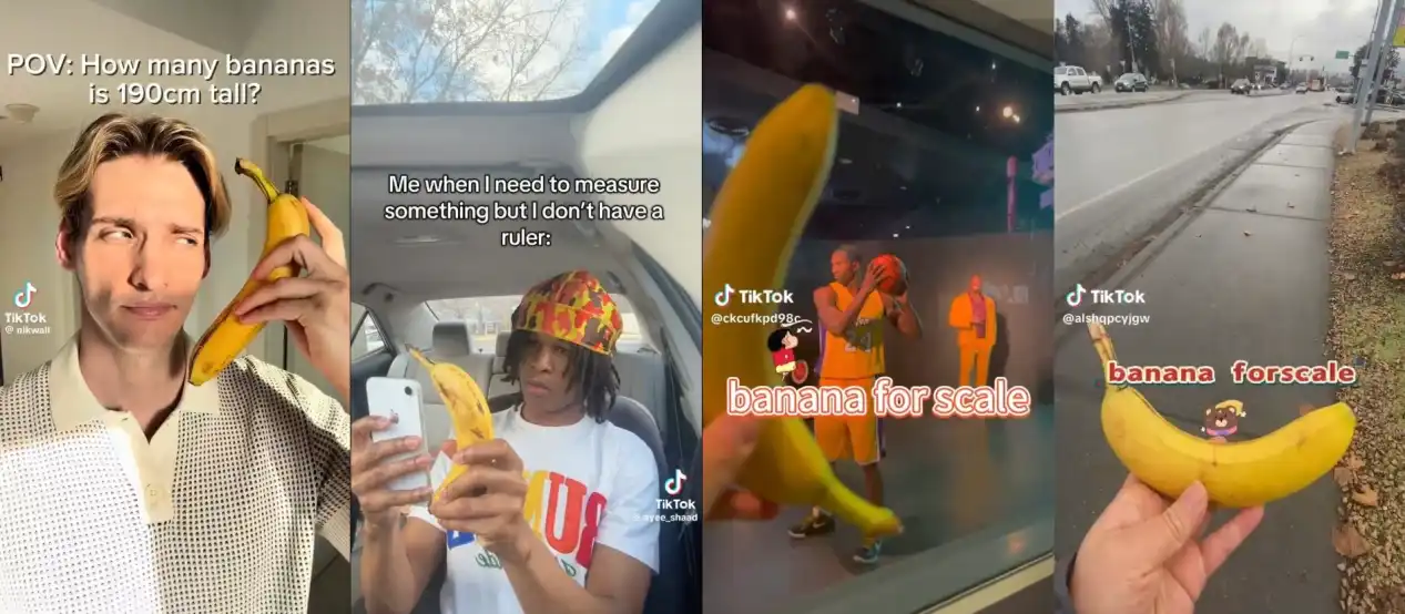 「Banana for Scale」起源于 2005 年博主 Rock Dog Designs 的玩笑行为,他用香蕉作为比例尺出售不知尺寸的旧电视。2008 年,《Peanut Butter Jelly Time》的香蕉全民口水歌,将香蕉 Meme 文化进一步推广。这种荒诞幽默的对比方式在 2010 年后爆火于社交媒体,成为展示相对大小的经典梗。在无数社交平台和用户的推波助澜下,它逐渐演变为一种充满幽默、包容的文化符号,不仅具有趣味性,更象征了一种用简单工具丈量复杂世界的独特哲学。