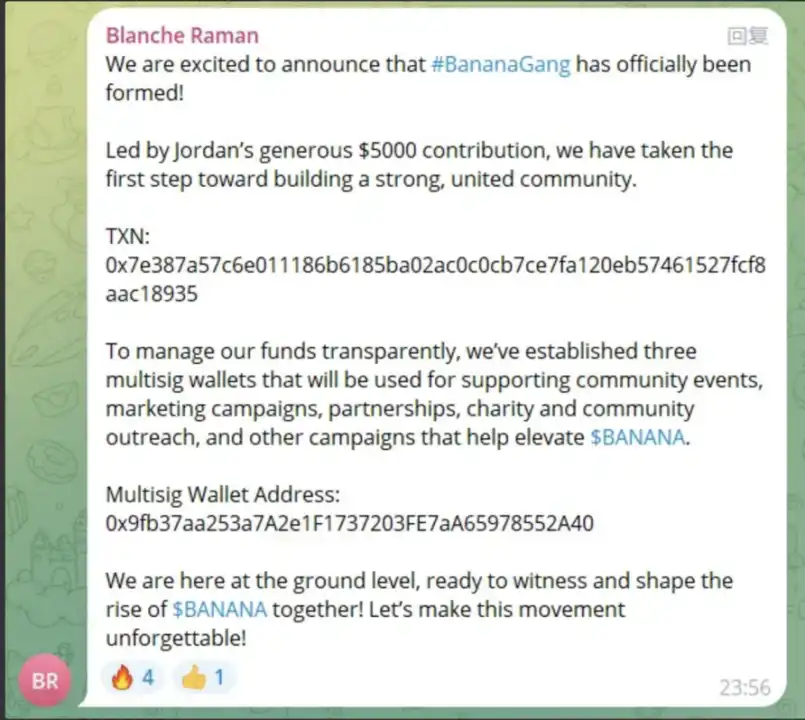 社区大户 @Cryptochitect3 带头开始建设,设立社区钱包,捐出价值$5K 的 BANANAS31 供社区举办活动,这一举动点燃了社区成员的热情,也宣告着社区 DAO 的成立。大家开始纷纷捐款,目的只有一个「建设」,两天时间内,筹集到了$16K,虽然金额不多,但社区的凝聚力开始影响更多人参与建设。