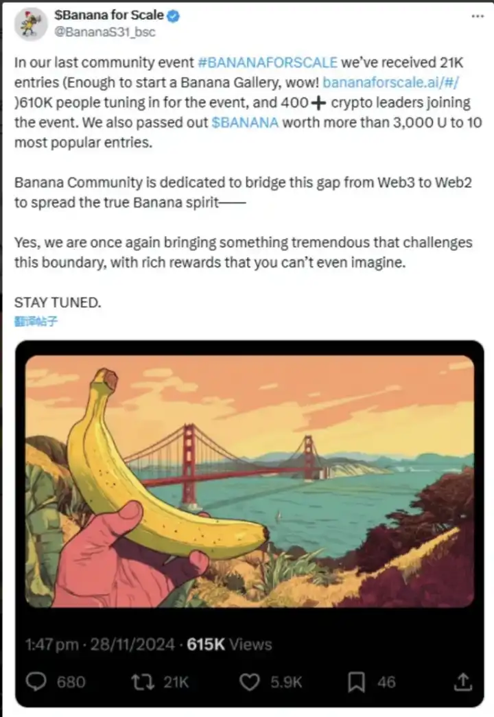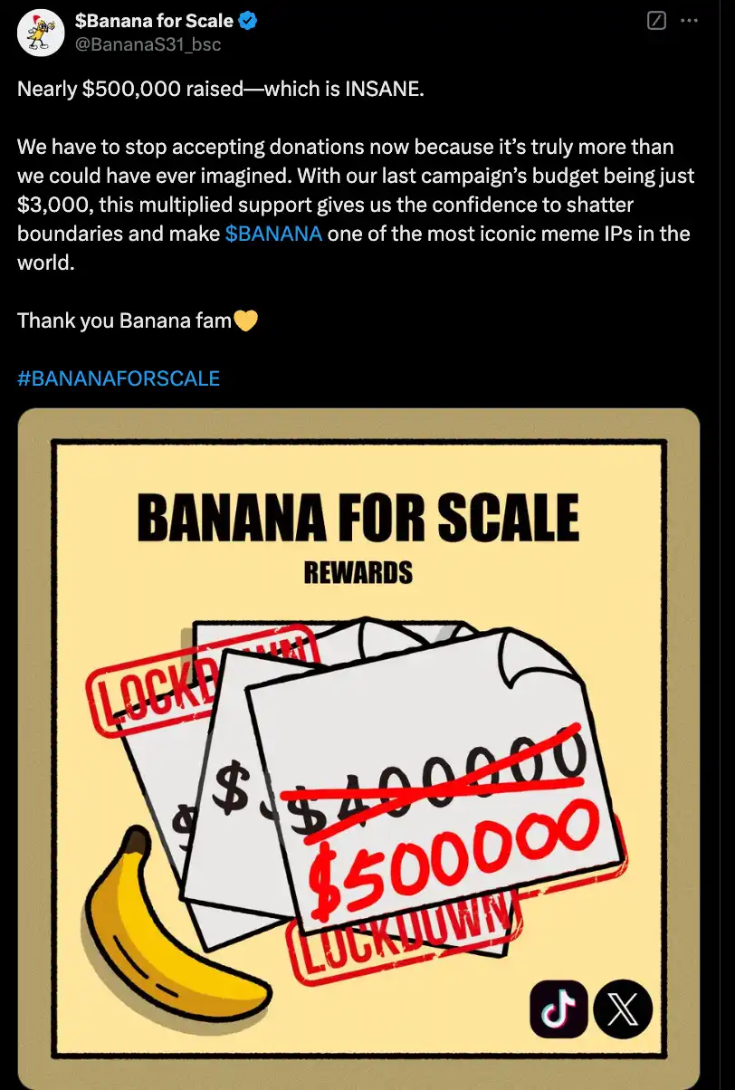 2024.12.14:社区-社区捐款筹集达 500,000 美元,社区利用募捐资金发起「Banana for Scale」TikTok 挑战赛