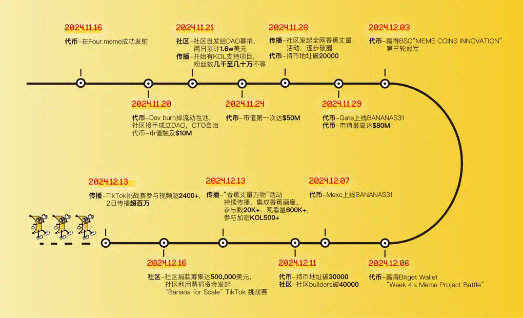KOL 们的支持和社区成员建设的决心成为 BANANAS31 社区发展的根基,来自不同国家和地区社区成员共同建设,推动 BANANAS31 从无人问津逐步走向壮大。11 月 29 日,Gate 上线 BANANAS31;12 月 3 日赢得 BSC「MEME COINS INNOVATION」第三轮冠军;12 月 6 日赢得 Bitget Wallet「Week 4's Meme Project Battle」;12 月 7 日 Mexc 上线 BANANAS31。12 月 11 日 BANANAS31 的社区规模已经突破 40000 人,持币地址数量突破 30000,很难想象这是一个上线不足一个月的项目。