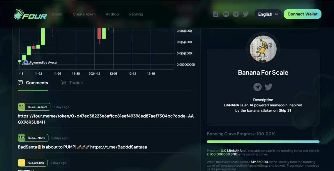 基于科技探索和乐观文化的角度,S31 发射后在各链涌现了很多 Meme 币,最终只有来自 BSC 链上的 BANANAS31 稳健发展。11 月 16 日 BANANAS31 在 BSC 链上的 Four.meme 平台成功发射并由 AI 开始运营,至今持续破圈,或许有可能成为科技与文化概念融合的 Meme 龙头。