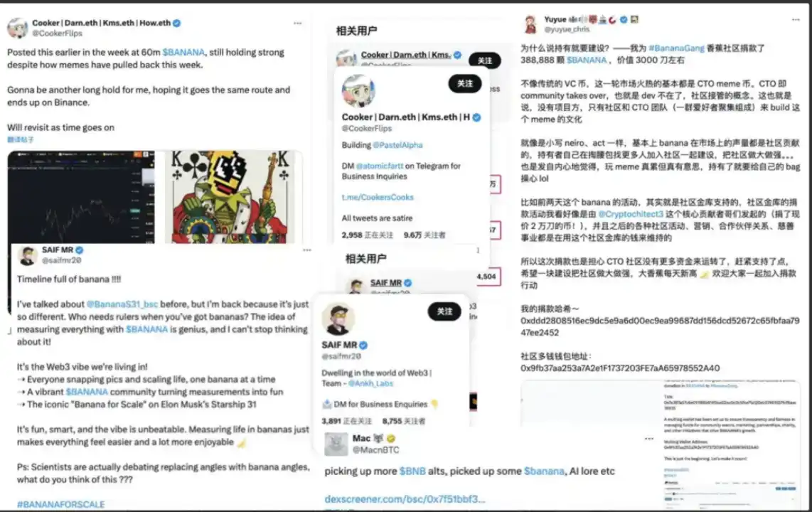 利用第一次筹集的资金,社区发起了「香蕉丈量万物」的活动,令人意想不到的传播量吸引了很多 KOL 关注这个项目。比如欧洲知名 KOL@MacnBTC,发推称「我们需要 BANANAS31 这样的 BNB Meme,需要这样的 AI 传说」,英文区 @CookerFlips,同样发推称「我会长期持有 BANANAS31」,中文区加密 KOL@yuyue_chri 先后两次捐款给社区钱包。