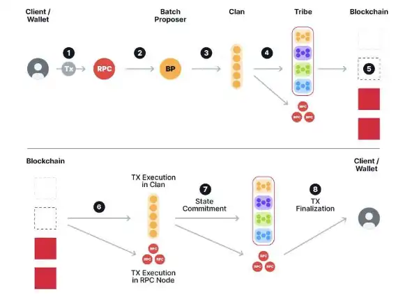· 批次通过 xRBC 协议传播到相应的执行氏族节点,必须形成数据可用性仲裁证书(DAQC)后,批次才能被包含到区块中。这些证书会传播到整个部落,批次也会传播到网关 RPC 节点。