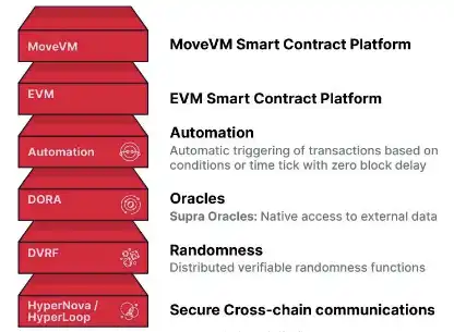 Supra 将多年来的多项创新成果集成到一个强大且高性能的架构中,该架构完全垂直集成了 MultiVM 智能合约支持和原生服务,包括价格预言机、链上随机数、跨链通信以及自动化功能。