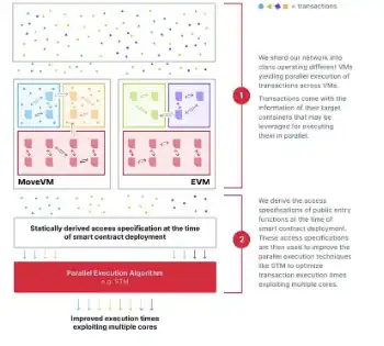 · 的方法则不同,区块提议者使用 BlockSTM 技术执行区块,预先计算交易之间的依赖关系,并将这些依赖信息包含在区块中,从而使其他验证者能够并行执行互不依赖的交易。