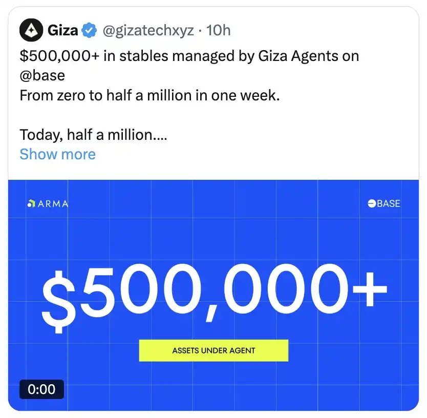 Gizatechxyz 目前管理的存款规模突破 50 万美元,其数千个 Agent 已在 Base 和 Mode 主网上线。