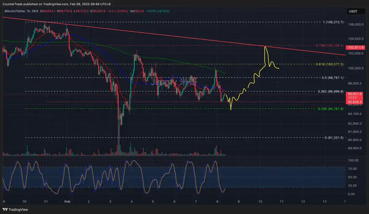 比特币处于震荡行情。市场逻辑是寻找流动性:那里最多人止损+爆仓去哪里,比特币日线收了两个长腿十字星,下周涨的可能性加大了,小周期还有最后一次下探的可能性,跌到 94600 左右,然后如果收回 95600+,那么拉升行情就要开始了,下周如果拉升,目标最低 100500,最高 103000。