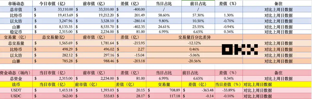 首先时隔一周时间,BTC 市值基本保持不变,但是市场以及 #ETH 山寨出现了的缩水,通过占比变化清晰发现,BTC 占比大幅度吸血市场,目前占比已经突破 58% 更加接近 59%,反观 ETH 占比直接跌破 10%,惨不忍睹。