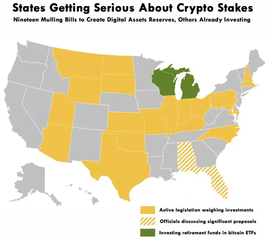 威斯康星州和密歇根州已经将比特币纳入公共员工退休投资组合,另外 23 个州也在积极辩论类似的提案。