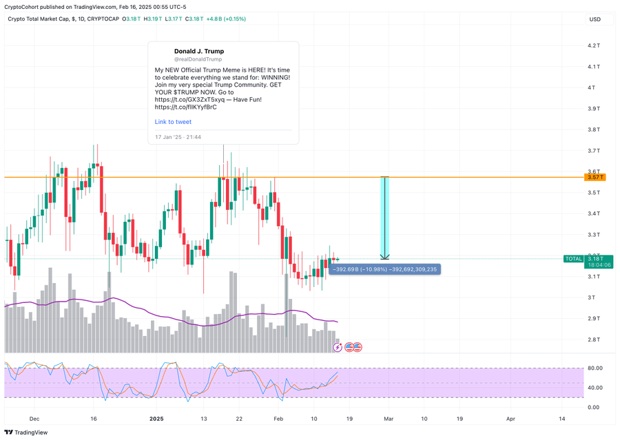 自从$TRUMP 代币推出以来,加密货币一直在稳步下跌。该代币于 2025 年 1 月 17 日发布,恰逢特朗普第二次就职前几天,代币引发了投机情绪,但未能持续推高市场。