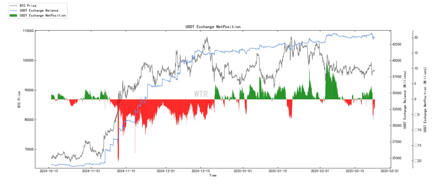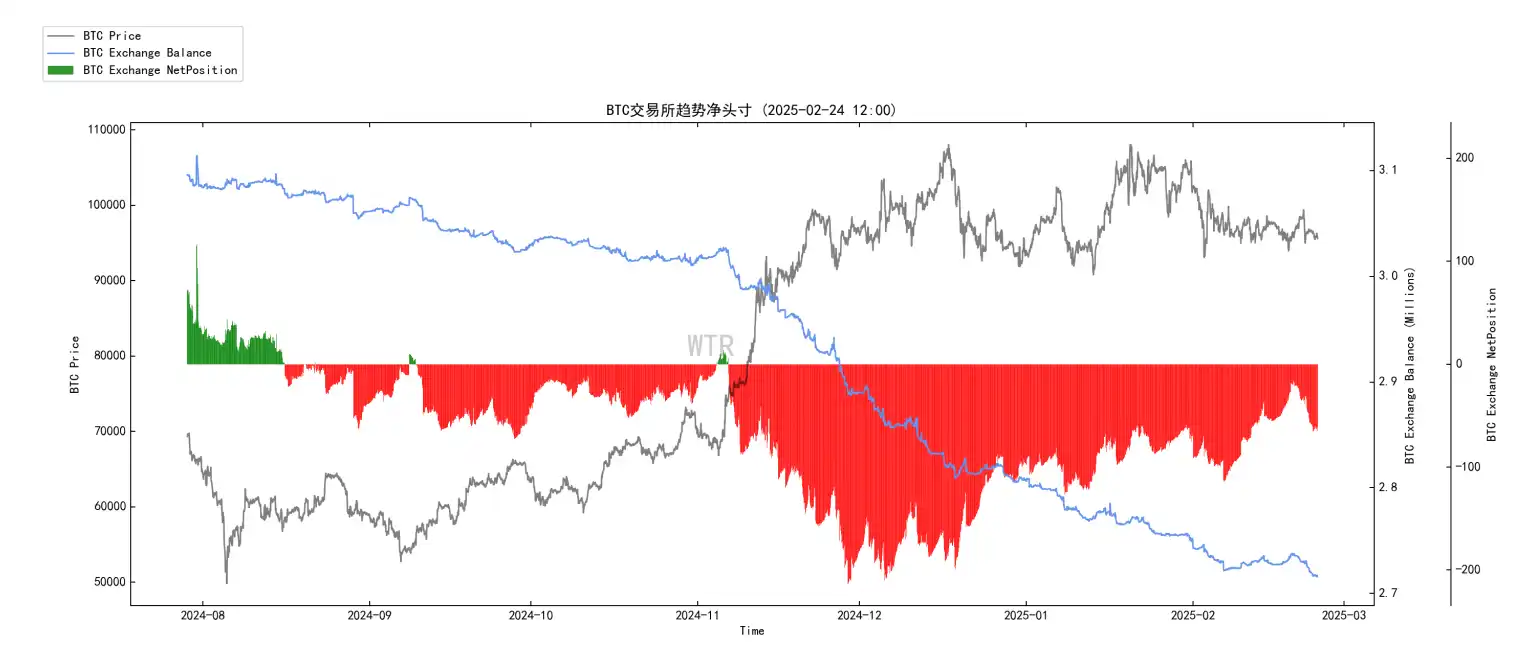 BTC 交易所净头⼨持续性⼤量流出累积。