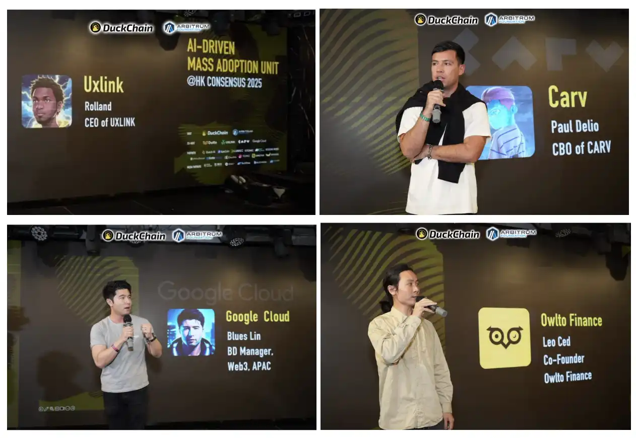 本次活动由 DuckChain 和 Arbitrum 主办,Owlto Finance、UXLINK、Carv、Google Cloud 共同协办,并获得 Quack AI、 ApeCoin、Lumoz、Utonic、Mind Network、KuCoin Web3、Infinity Ground、Gate Web3、CloudMile、Tomo Wallet、AIME、The Banana Game 等知名项目支持。现场吸引了超 600 位行业精英参与,围绕 AI 与 Web3 的融合展开深度讨论。