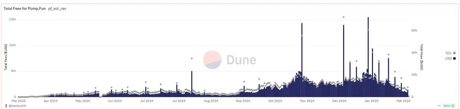 Pumpfun 的总收入接近 6 亿美元,以至于美国总统 Trump 和其家人也发行了自己的代币,说明了 memecoin 的爆发与高潮期。从 Dune 上面的分析看,memecoin 也在经历一个从产生,到成长,到爆发的周期。