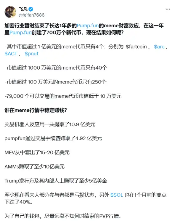 Twitter 上的一个分析数据也很好的说明了 memecoin 模式的问题。(这个数据的可靠性笔者没有证实)