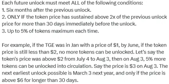 (3)项目团队有权推迟或减少每次解锁的规模。如果他们不想卖出更多,他们不必这样做。但每次他们最多可以卖出(解锁)5%,然后他们必须等待至少 6 个月,价格再次翻倍。(这个设计必须要 DAO 这样第三方的机构来做,把团队有权做,变成 DAO 有权决定做。因为项目团队也是 DAO 的重要成员,应该不会产生过多的副作用)
