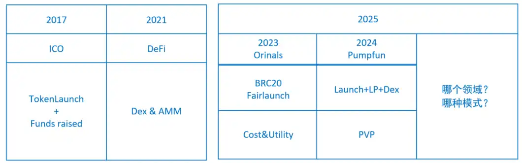 2023 年的铭文与 2024 年的 pumpfun 现象是一些牛市可能爆发的现象。如果能够解决铭文与 pumpfun 本身的问题,有更完善的模式产生,在某些领域有可能会促成牛市的爆发。大概率还是和发资产、交易资产相关。