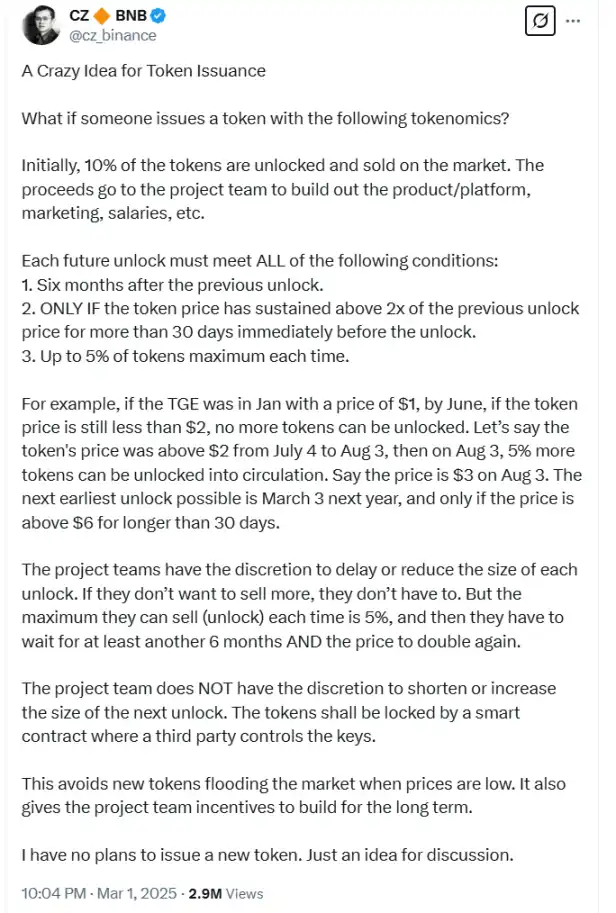 不只是 VC 币和 meme 币现象引起大家的更多思考,行业内的很多知名人士也提出过类似的问题,都在力求找到解决方案。例如,在何一回答闺蜜币的 twitter space 活动中,Jason(陈剑)提出过 Binance 上线的 Token 是否有机制解决项目团队上所就卖币然后躺平的问题。还有最近 CZ 发表的《A Crazy Idea for Token Issuance》都在试图找到解决相关问题的方法。