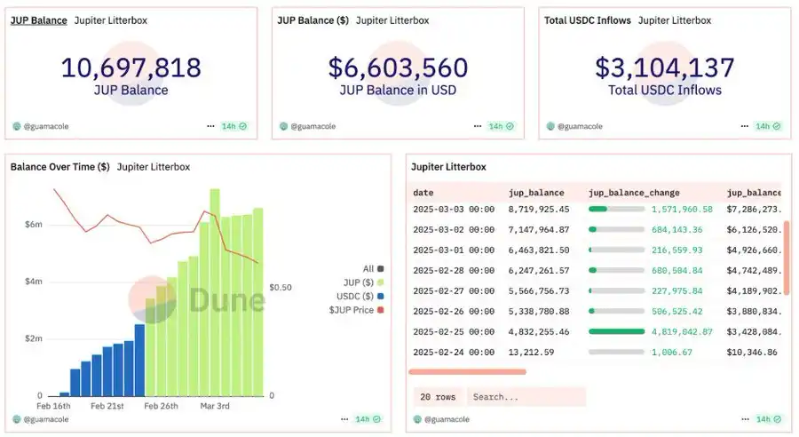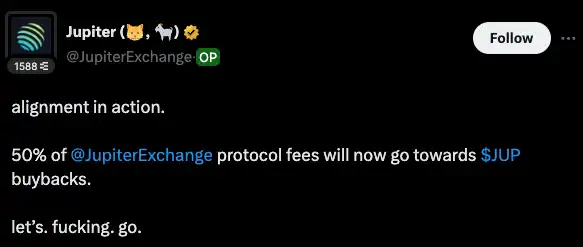 Jupiter 自 2025 年 2 月 17 日起,已开始将 50% 的协议费用用于回购并锁定 JUP 代币,为期三年。该举措旨在减少流通供应量,增强长期稳定性,并促进 Solana 生态的用户参与。今年 2 月,Jupiter 完成了首次回购,以 333 万美元购入 4.88 万枚 JUP。目前,Jupiter 的 Litterbox Trust 回购计划已累计回购超 1000 万枚 JUP(约 600 万美元)。