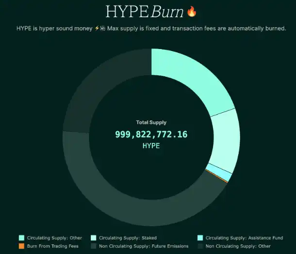 Hyperliquid 的原生代币 HYPE 总供应量为 10 亿枚,且 无融资,无投资者分配。具体分配如下: