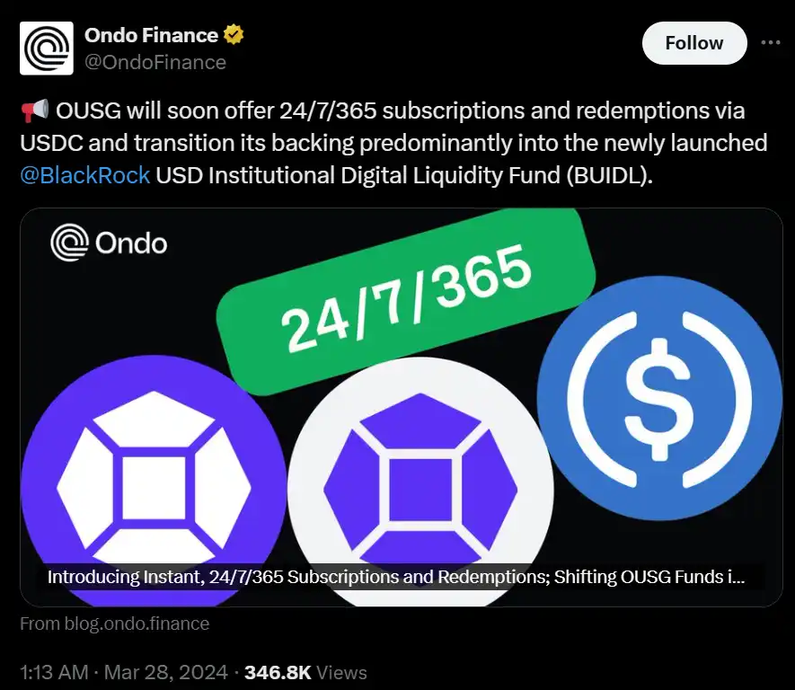 随后,贝莱德通过与 Securitize 等机构的合作,推动 RWA 市场从 2023 年的 1 亿美元暴增至超 13 亿美元。来看棋局的另一角,Ondo Finance 其 OUSG 代币直接挂钩 BUIDL,为散户提供代币化国债投资渠道,Vest 的加入,则补全了贝莱德在链上衍生品市场的布局。
