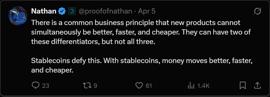 我的核心观点很简单:稳定币将取代传统支付方式,因为它们更好、更快、更便宜。