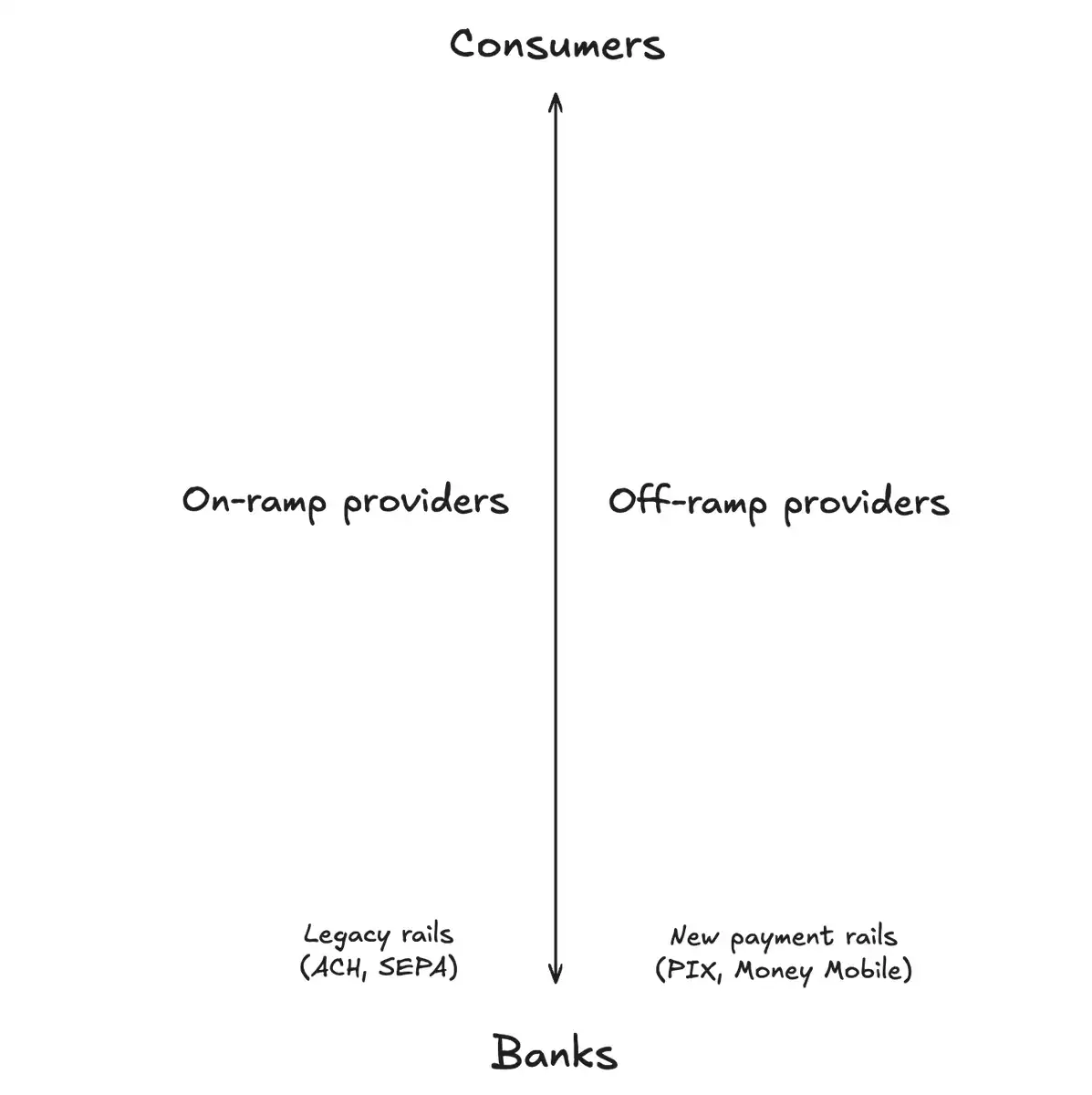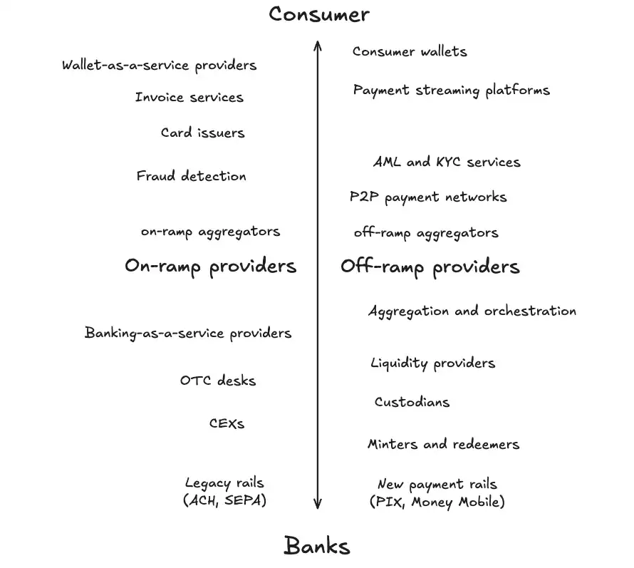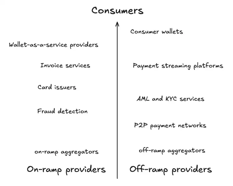 P2P 支付在一些发展中国家被广泛采用,但相较整体支付栈,它效率较低、成交体量也较小,更像是传统通道的补充方案。最后,on/off-ramp 聚合器位于消费者服务层的最底部。