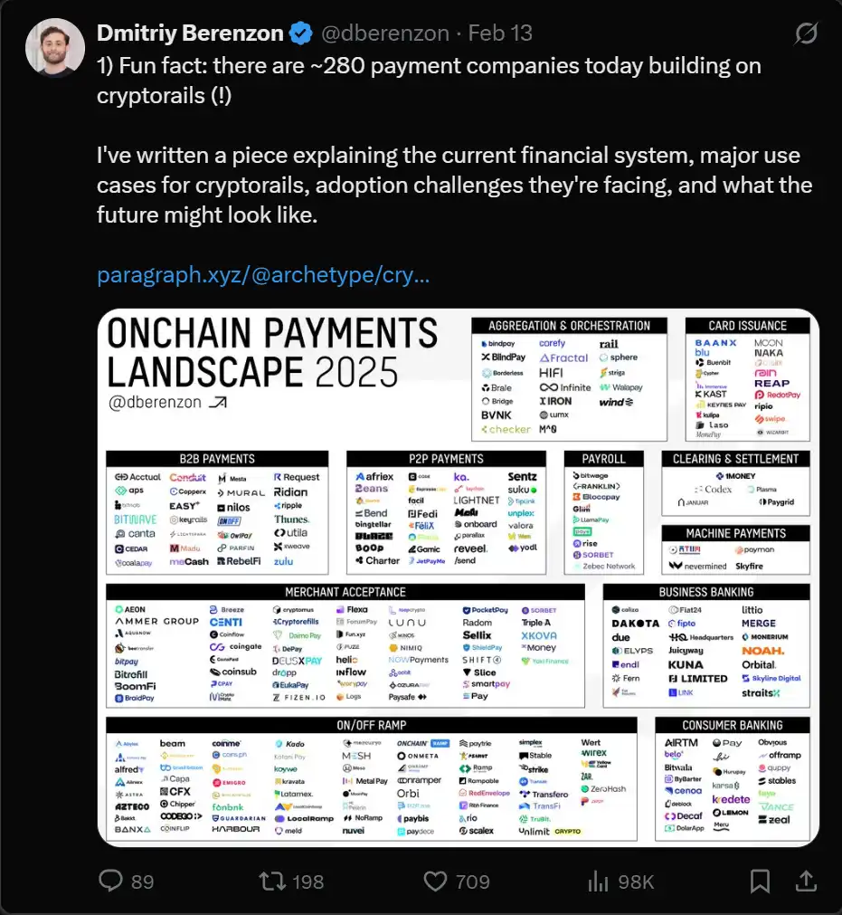 @Dberenzon 整理了一张非常出色的图表,把链上支付生态拆分为九个不同的细分领域,下面就是这张图。