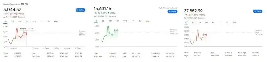 但后续据核实,哈塞特当天在接受福克斯新闻采访时的原话是「总统会做出他要做的决定」,并未明确「特朗普正考虑对部分国家暂停征收 90 天关税」,白宫新闻秘书卡罗琳·莱维特也出面辟谣,称这是「假新闻」。由此美股再次由涨转跌,几小时内道指、标普 500 指数及纳斯达克指数均基本抹去「推迟关税 90 天」消息带来的涨幅。