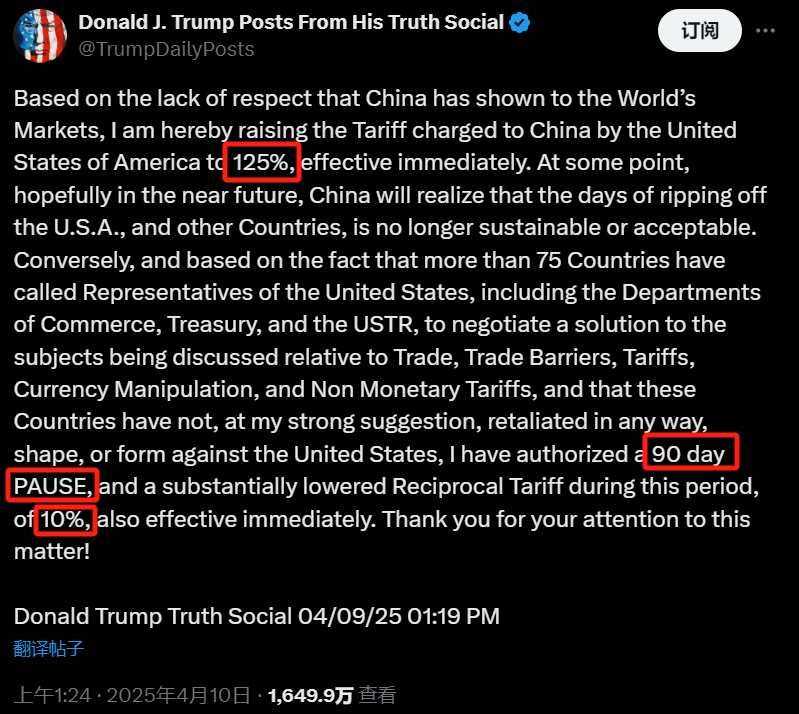 前一日,特朗普刚扔下向中国征收 104% 关税的炸弹,加剧了全球股市的下跌,今日,又发文宣布另一重磅消息:由于中国的不公平贸易行为,美国将对中国进口产品征收 125% 的关税,并立即生效;另一方面,对于其他超过 75 个不采取报复措施的国家,他设定了为期 90 天的关税暂停期,当前只征收 10% 的对等关税,旨在鼓励贸易谈判。